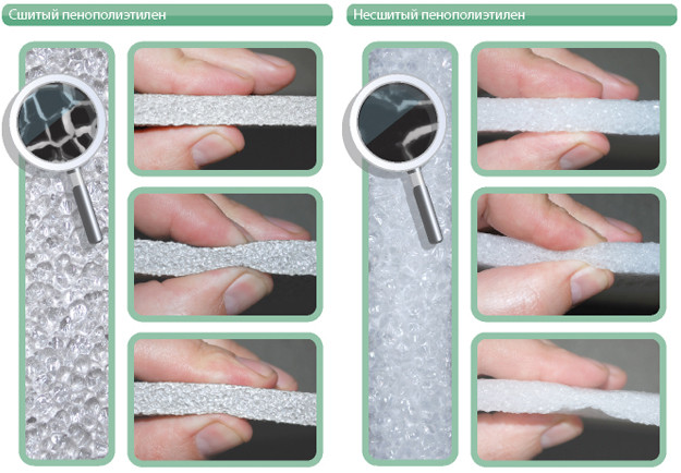 Існує кілька різних технологій спінювання поліетилену. В залежності від використовуваної технології розрізняють зшиті і несшитые пінополіетилени.